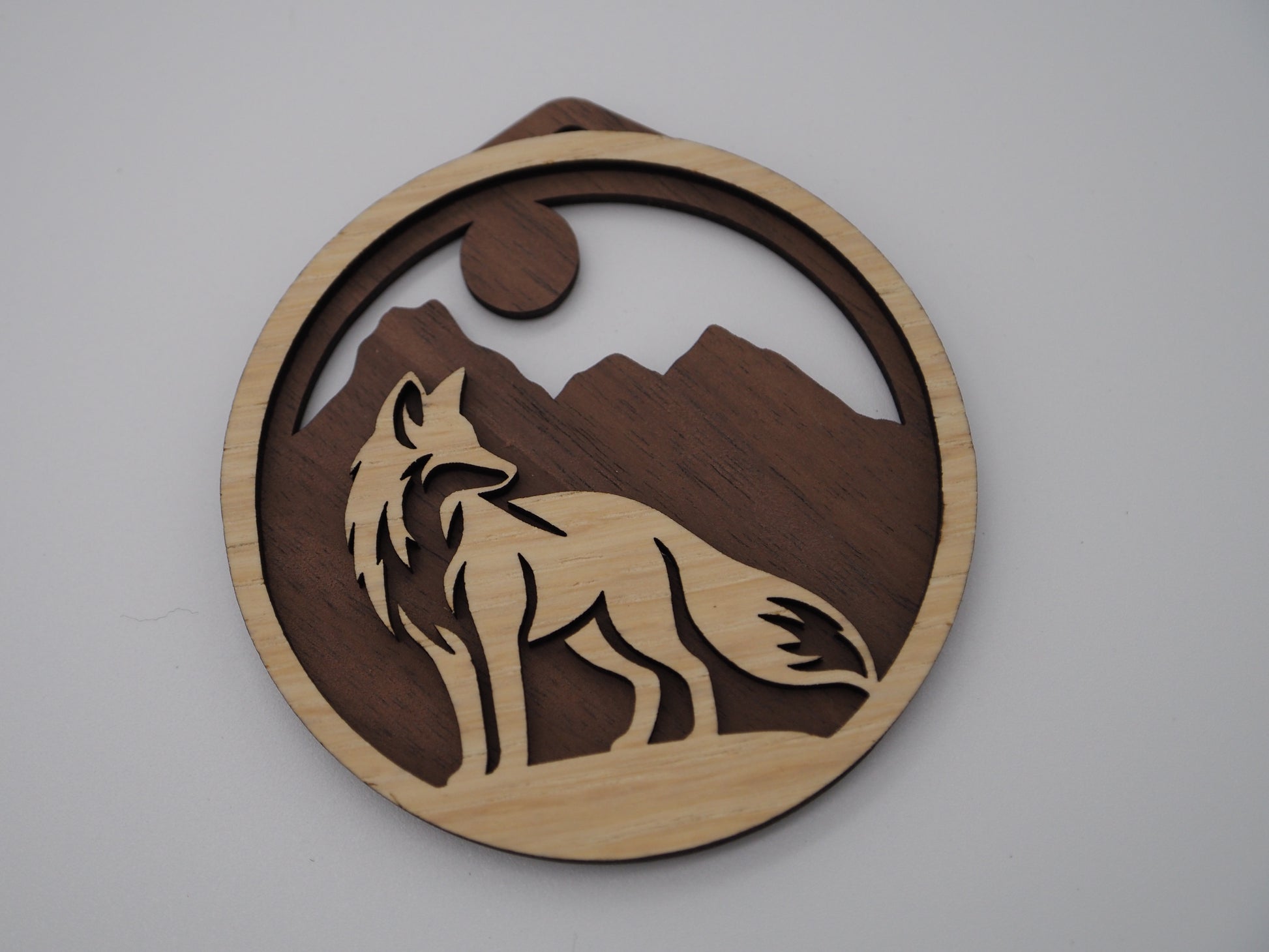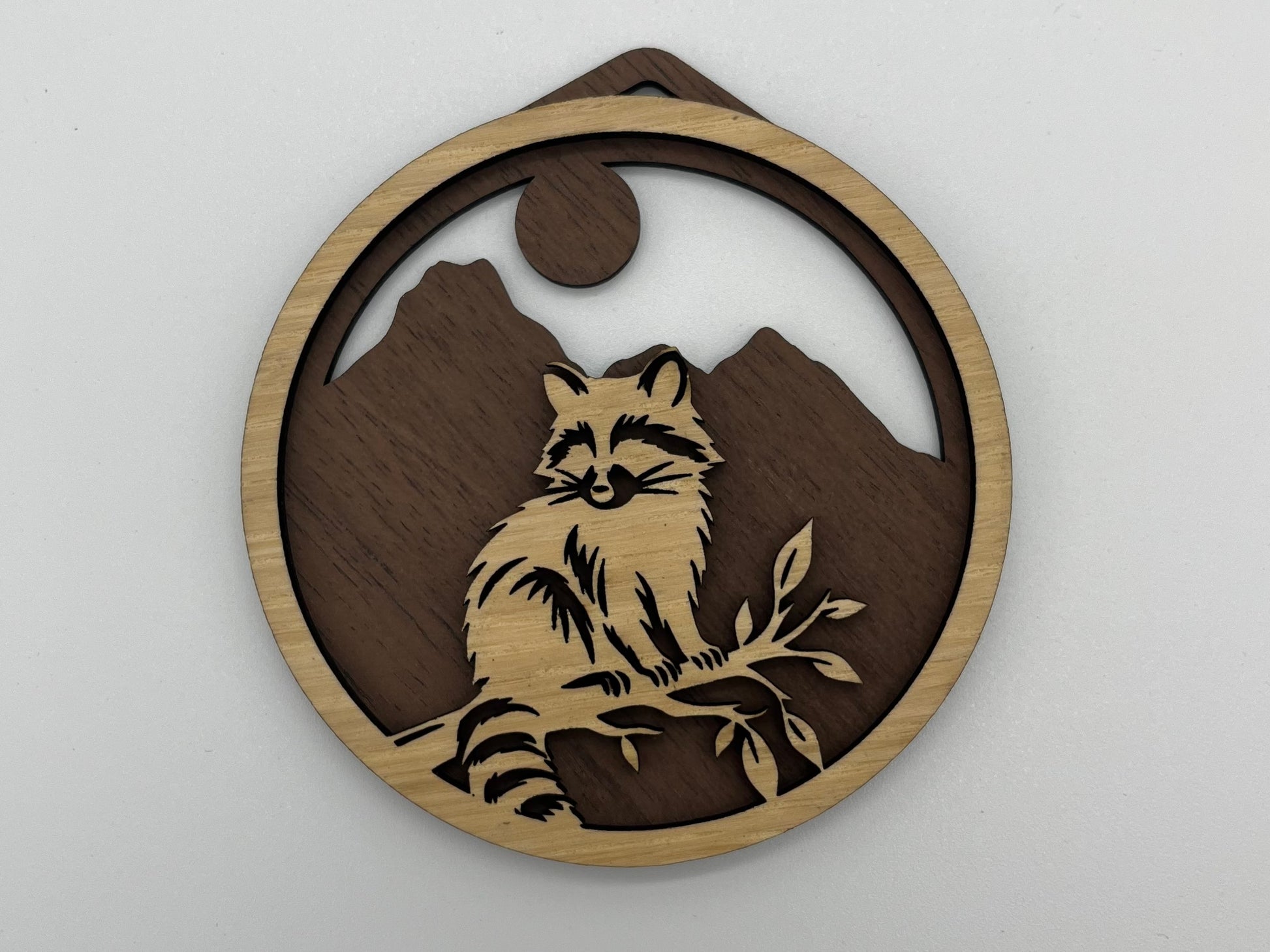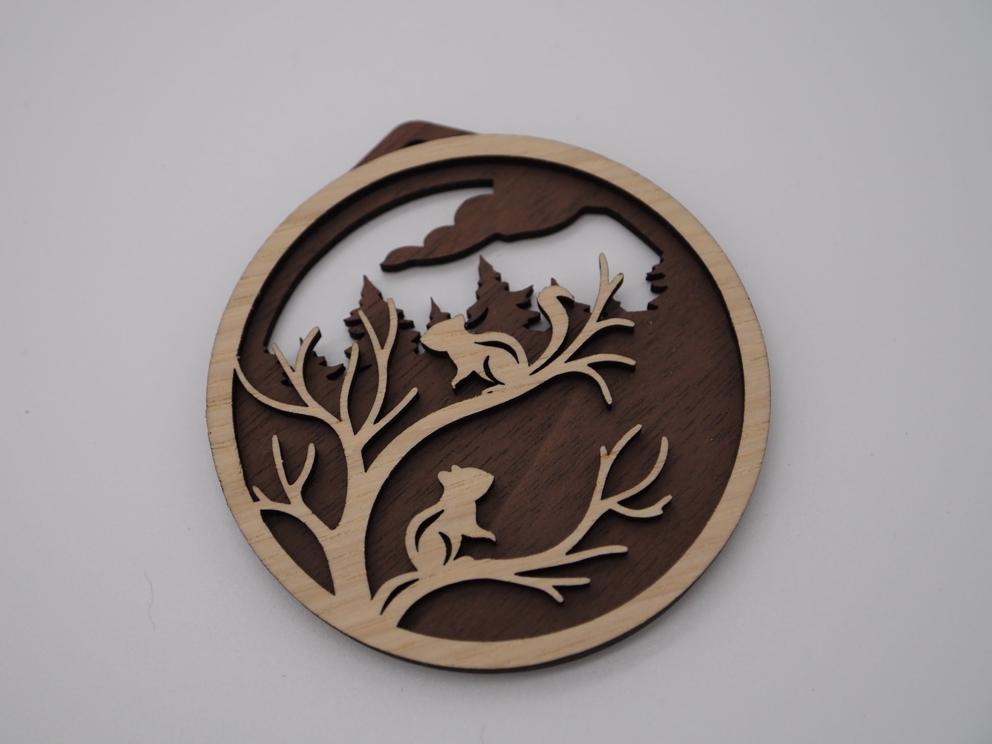 2-layer wooden hanging ornaments, laser cut from black walnut and white oak plywood. Featuring 6 fun critter-themed designs, available individually or as a set.