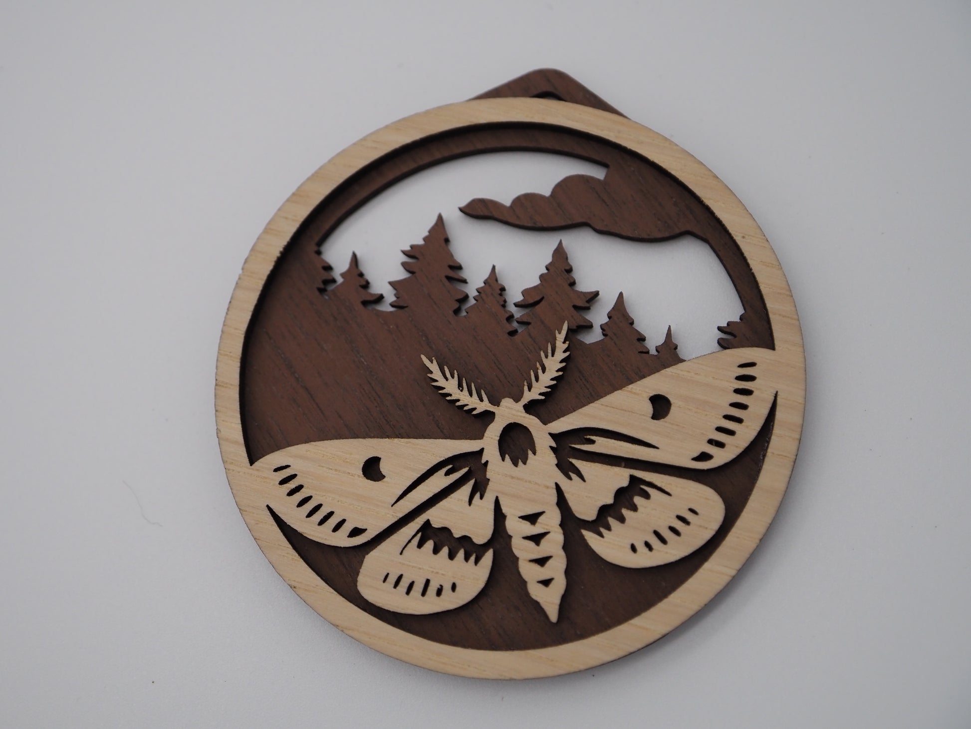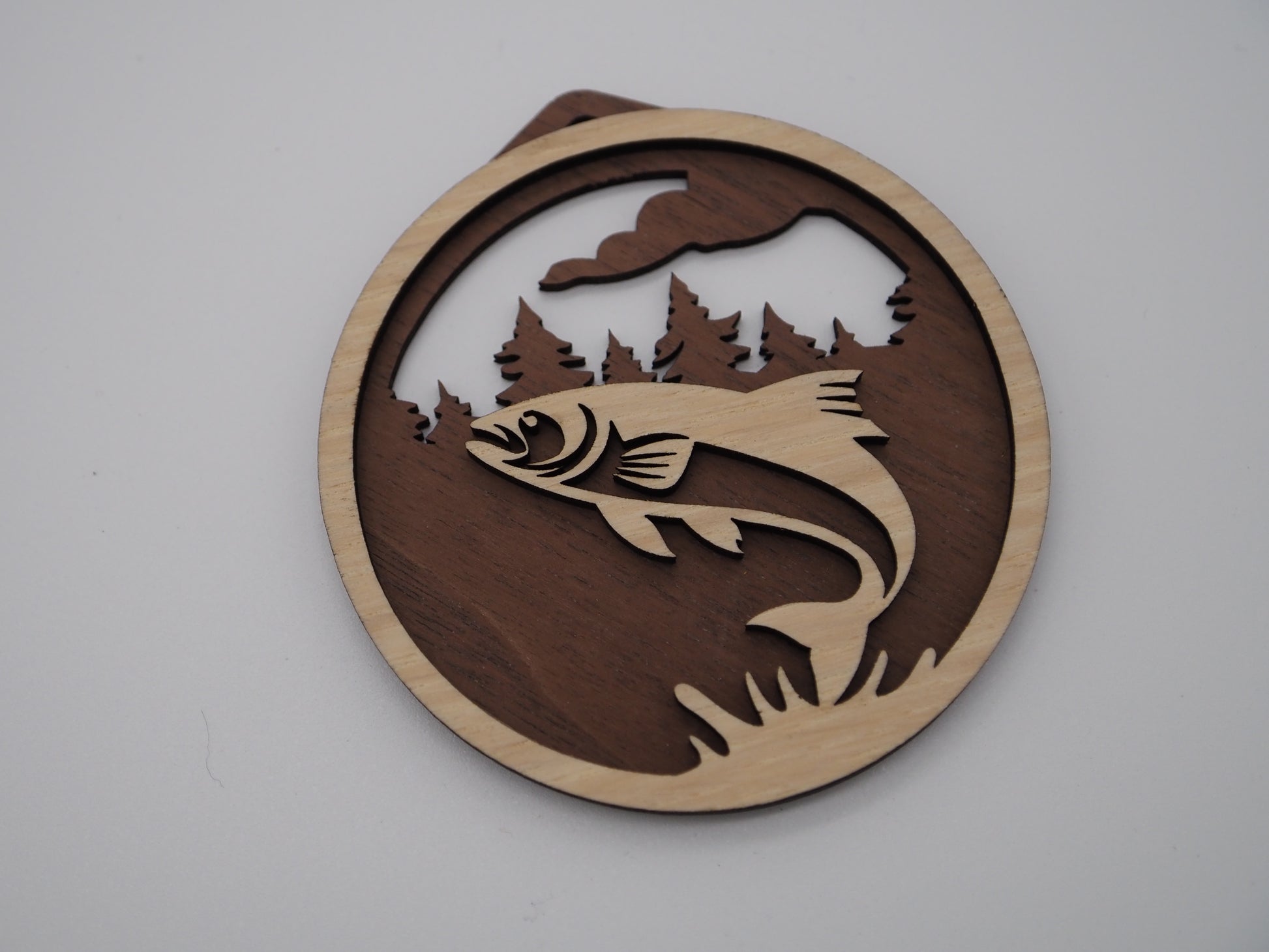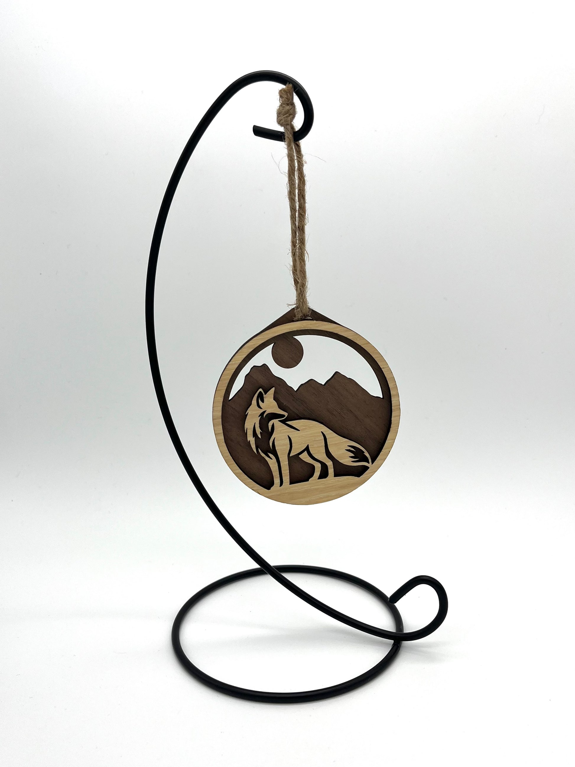 2-layer wooden hanging ornaments, laser cut from black walnut and white oak plywood. Featuring 6 fun critter-themed designs, available individually or as a set.