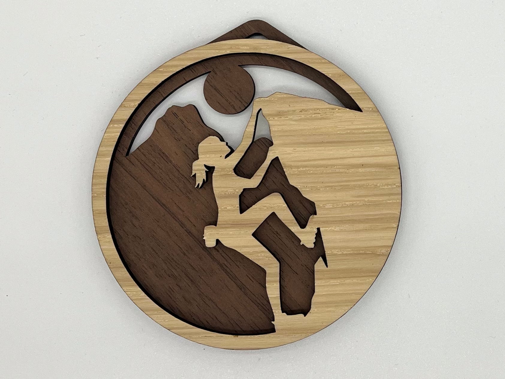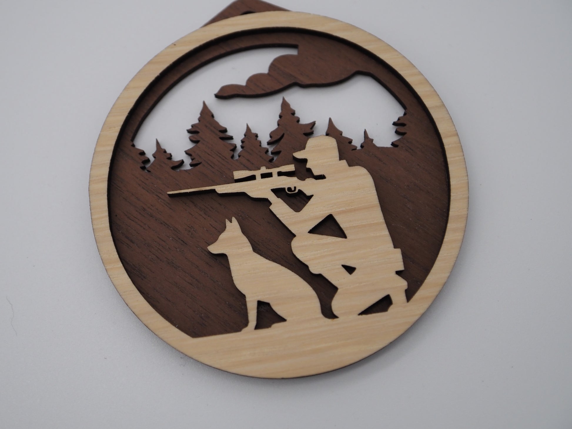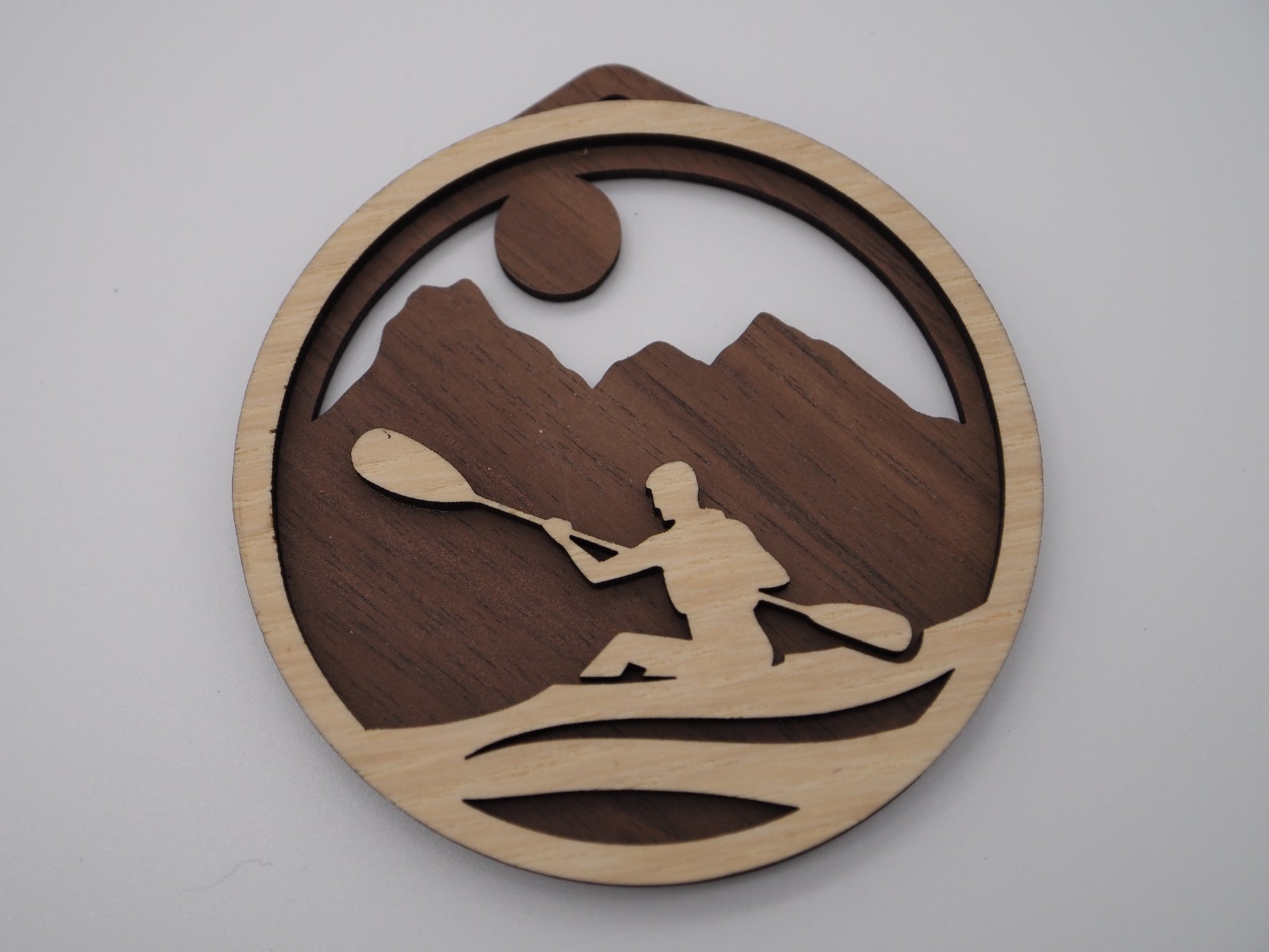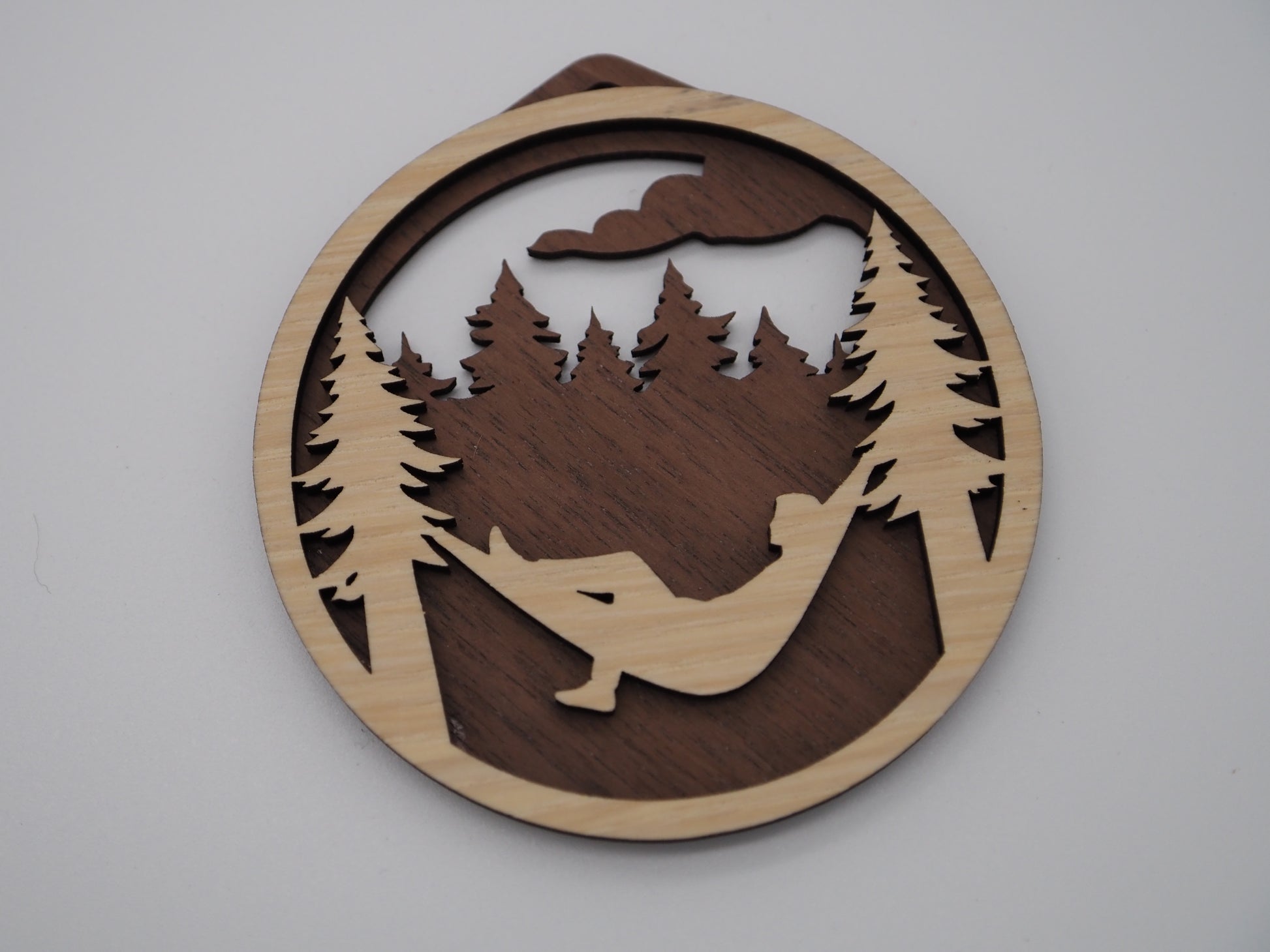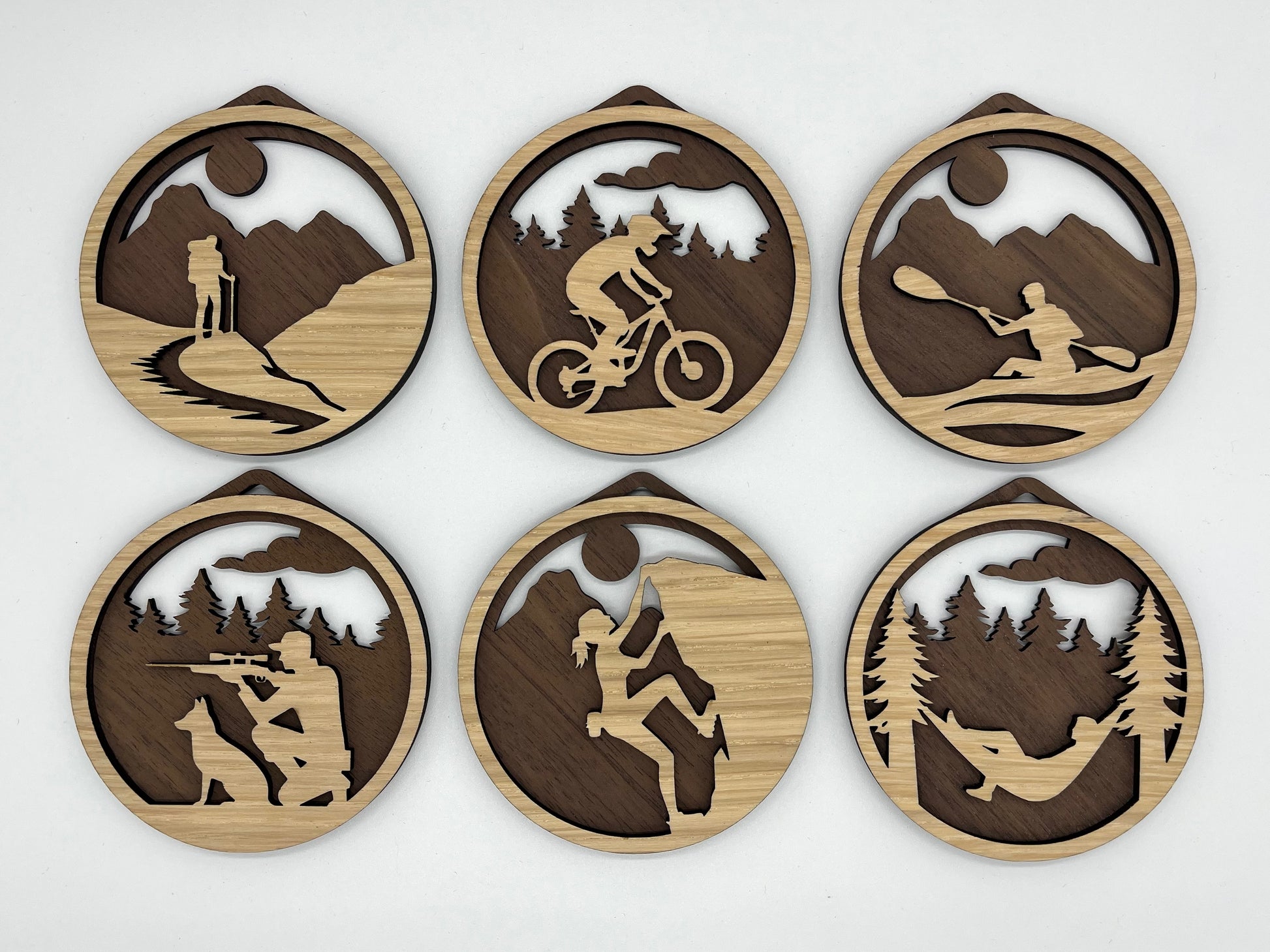2-layer wooden hanging ornaments, laser cut from black walnut and white oak plywood. Featuring 6 fun recreation-themed designs, available as a set or individually.